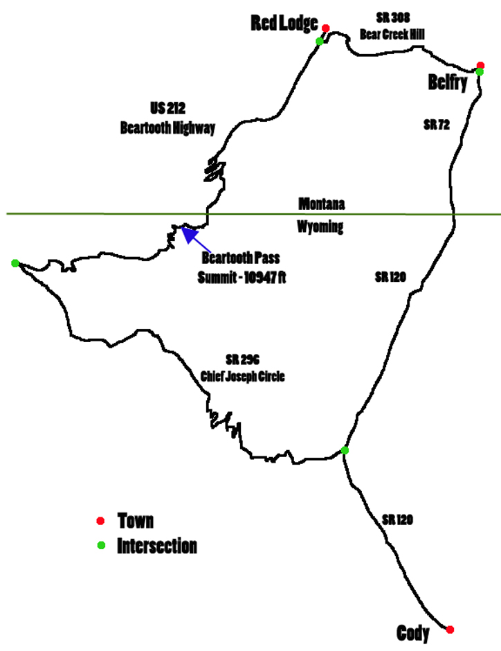 The ride begins in Cody, Wyoming. On the east side of town, take SR 120 also known as the Belfry Highway north for about 16.5 miles. The road comes to a T. Go to the left onto SR 296 - Chief Joseph Circle. Following Chief Joseph Circle for 45 miles you will travel through some breathtaking vistas with lots of winding switchbacks leading you higher and higher into the mountains. At the end of the Chief Joseph Circle, you will take a left onto US 212, the Beartooth Highway. As you climb higher you will eventually reach the summit of the Beartooth Pass at 10,947 ft. Continuing for a total on the Beartooth Highway of about 50 miles, you will come to the town of Red Lodge, Montana. Before you enter the town, notice SR 308 to your right which is also called Bear Creek Hill. After visiting Red Lodge you will come back to this road and take it to Belfry 15.5 miles east. Make a right onto SR 72 which will take you through a relatively flat area for about 48 miles back to Cody. SR 72 changes into SR 120 once you cross back into Montana. The entire ride is 175 miles long. It should take you about 8 hours if you make stops along the way and have lunch in Red Lodge. Make sure your tank is full before you leave Cody and then fill up again in Red Lodge. Climbing mountain roads tends to reduce your gas mileage and gas stations are few and far between.