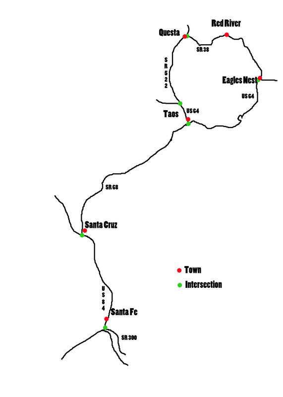 Starting on SR 300, ride towards Santa Fe. Just before you get to downtown, about 10 miles, you will make a right onto US 84. After 27 miles you will be in Santa Cruz where you will make a right onto SR 68. As you ride the next 43 miles to Taos, the Rio Grande River will wind along the road with you for most of the way. Once in Taos, you may be ready for breakfast or lunch. There are a good restaurants in town but for some reason there aren't as many as you would expect. Taos Diner towards the middle of town and Michael's Kitchen at the north end of town, both on SR 68 are a couple of the good ones. In the middle of town, SR 68 turns into US 64 which you will follow for about 4 miles when the road forks. The right fork is SR 522 which you will take to Questa, about 20 miles. In Questa, make a right turn onto SR 38 and 12 miles later you will be in downtown Red River. To complete the loop, continue on SR 38 for 17 miles to Eagles Nest where you hook up with US 64 which will take you back to Taos and SR 522.